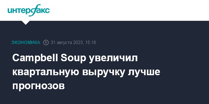 Москва. 31 августа. INTERFAX.RU - Американский производитель продуктов питания Campbell Soup Co. в четвертом квартале 2023 финансового года (завершился 31 июля) увеличил выручку на 4,1% благодаря повышению отпускных цен на свою продукцию.