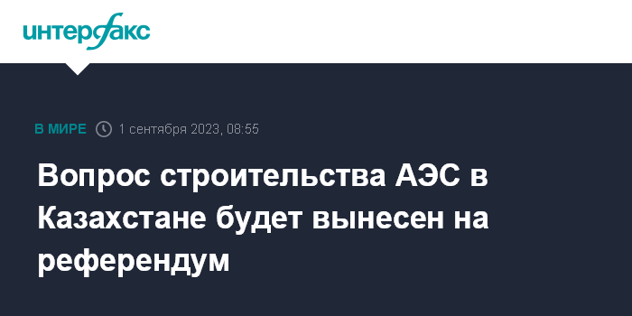 Москва. 1 сентября. INTERFAX.RU - Президент Казахстана Касым-Жомарт Токаев предложил вынести вопрос строительства АЭС на общенациональный референдум, сроки будут определены позднее.