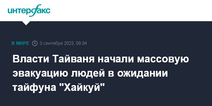 Москва. 3 сентября. INTERFAX.RU - Тысячи людей были эвакуированы на Тайване из-за тайфуна "Хайкуй", который, как ожидается, обрушится на остров в воскресенье, сообщила французская Le Monde.