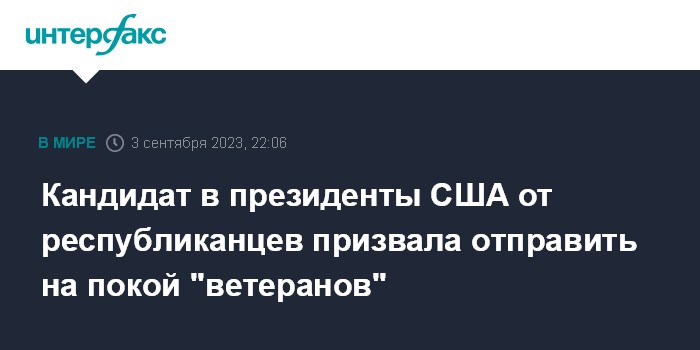 Москва. 3 сентября. INTERFAX.RU - Участница президентской гонки от Республиканской партии США, экс-постпред при ООН Никки Хейли заявила, что возрастным американским политикам пора уйти на покой, уступив места более молодым кандидатам.