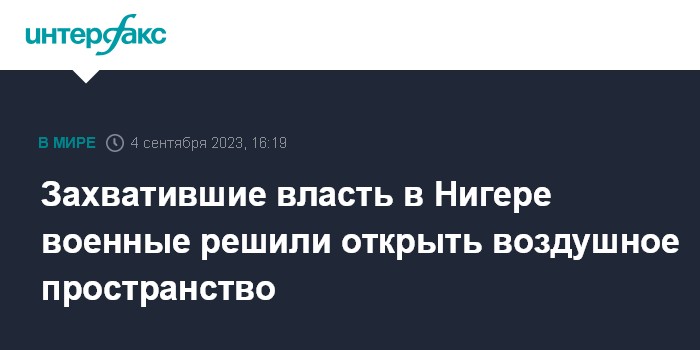 Москва. 4 сентября. INTERFAX.RU - Военное руководство Нигера приняло решение с понедельника открыть воздушное пространство, сообщают в понедельник франкоязычные СМИ.