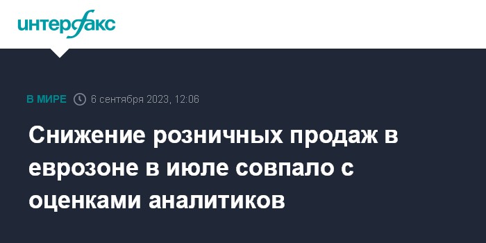 Москва. 6 сентября. INTERFAX.RU - Розничные продажи в еврозоне в июле снизились на 0,2% относительно предыдущего месяца, согласно данным Статистического управления Европейского союза (Eurostat).