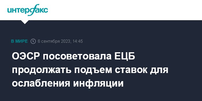 Москва. 6 сентября. INTERFAX.RU - Европейскому центральному банку (ЕЦБ) следует сохранять ограничительную денежно-кредитную политику, чтобы добиться устойчивого ослабления инфляционного давления в еврозоне. Об этом говорится в обзоре Организации экономического сотрудничества и развития (ОЭСР).