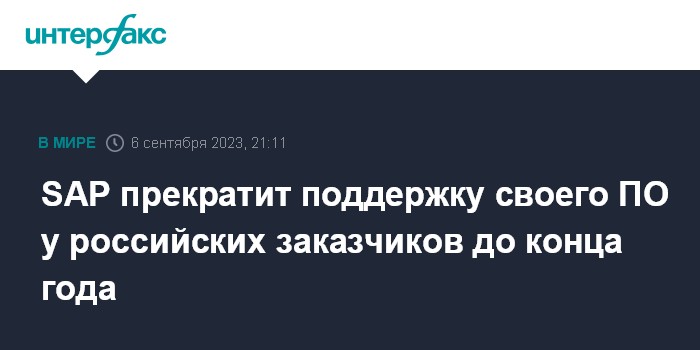 Москва. 6 сентября. INTERFAX.RU - Германский разработчик программного обеспечения для корпоративного сегмента SAP до конца текущего года прекратит поддержку своих решений у российских заказчиков. По словам участников рынка, соответствующее уведомление SAP начал рассылать заказчикам в РФ.
