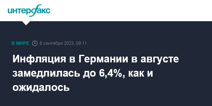 Инфляция, рассчитанная по германским стандартам, в прошлом месяце замедлилась до 6,1% в годовом выражении с 6,2% в июле. Это минимальный показатель за последние три месяца.