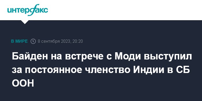 Москва. 8 сентября. INTERFAX.RU - Президент США Джо Байден в пятницу на встрече с премьером Индии Нарендрой Моди заявил, что выступает за реформу ООН и предоставление Индии статуса постоянного члена СБ ООН.