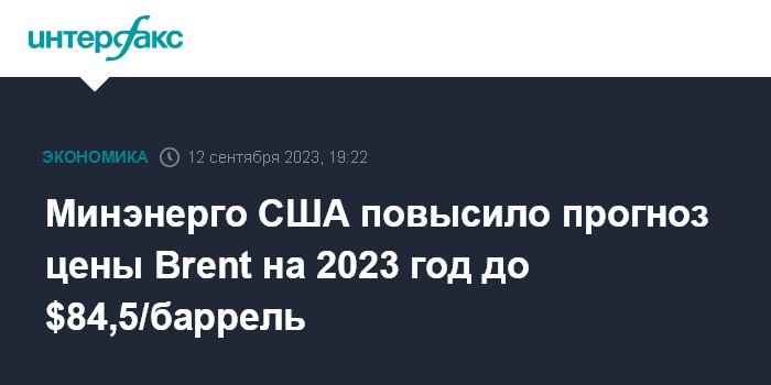 Москва. 12 сентября. INTERFAX.RU - Минэнерго США повысило прогноз цены нефти сорта Brent на 2023 год с $82,62 за баррель до $84,46 за баррель, говорится ежемесячном прогнозе управления энергетической информации ведомства (EIA).