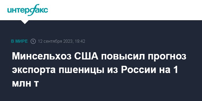 Москва. 12 сентября. INTERFAX.RU - Минсельхоз США в очередной раз повысил оценку экспорта пшеницы из России в этом сельхозгоду (июль 2023 - июнь 2024 года).