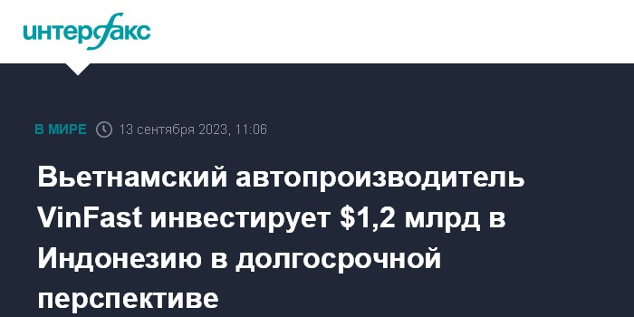 Москва. 13 сентября. INTERFAX.RU - Вьетнамский производитель электромобилей VinFast Auto Ltd. планирует инвестировать $1,2 млрд в Индонезию в долгосрочной перспективе. Об этом говорится в сообщении компании, направленном в американскую Комиссию по ценным бумагам и биржам (SEC).
