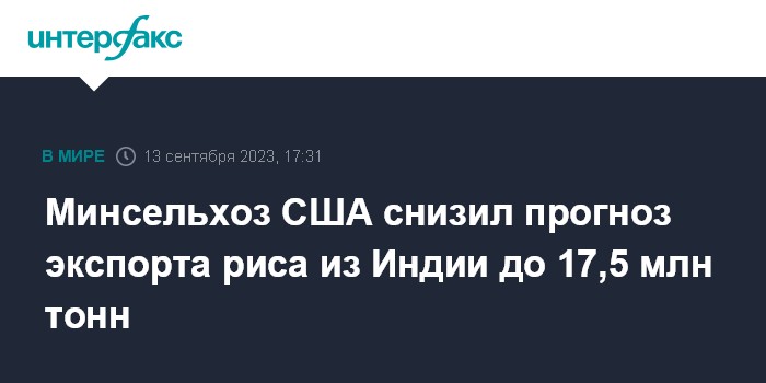 Москва. 13 сентября. INTERFAX.RU - Минсельхоз США в сентябрьском обзоре снизил оценку экспорта риса из Индии в следующем году до 17,5 млн тонн с 19 млн тонн по августовскому прогнозу. В текущем году экспорт ожидается в объеме 20 млн тонн.