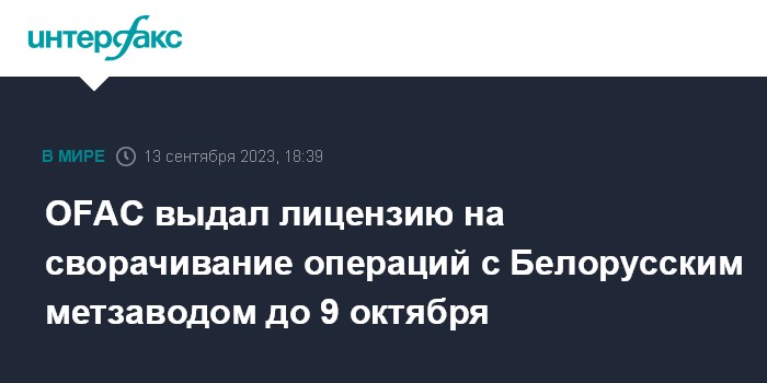 Москва. 13 сентября. INTERFAX.RU - Управление по контролю за иностранными активами Министерства финансов США (OFAC) в среду опубликовало лицензию на сворачивание операций с Белорусским металлургическим заводом (БМЗ, управляющая компания холдинга "Белорусская металлургическая компания") до 9 октября 2023 года.