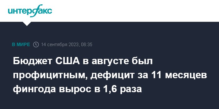 Бюджет США в августе был профицитным, дефицит за 11 месяцев фингода вырос в 1,6 раза