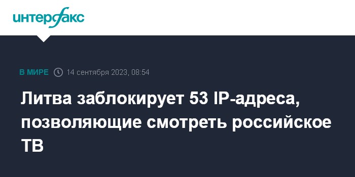 Москва. 14 сентября. INTERFAX.RU - Комиссия по телевидению и радиовещанию Литвы (КТРЛ) решила заблокировать 53 IP-адреса, которые дают возможность смотреть основные российские телепрограммы, запрещенные к трансляции в республике. Интернет-провайдерам направлены соответствующие указания, передает BNS.