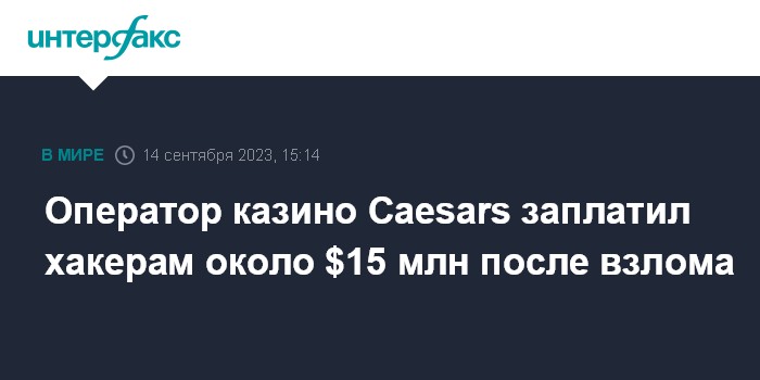 Москва. 14 сентября. INTERFAX.RU - Американский оператор казино и отелей Caesars Entertainment Inc. выплатил хакерам около половины от затребованных ими $30 млн после кибератаки, состоявшейся в конце августа, пишет The Wall Street Journal.