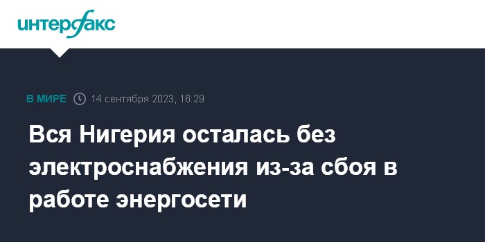 Москва. 14 сентября. INTERFAX.RU - На всей территории Нигерии в четверг прекратилась подача электроэнергии, передает "Аль-Джазира".