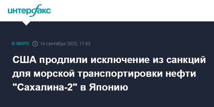 Москва. 14 сентября. INTERFAX.RU - США продлили действие исключения из санкций для поставок нефти проекта "Сахалин-2" в Японию до 28 июня 2024 года, сообщил Минфин США.