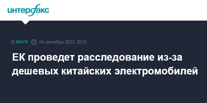 Москва. 14 сентября. INTERFAX.RU - Еврокомиссия (ЕК) проведет расследование в связи с увеличением на рынке ЕС дешевых электромобилей из Китая, заявила официальный представитель ЕК Мириам Гарсия Феррер.