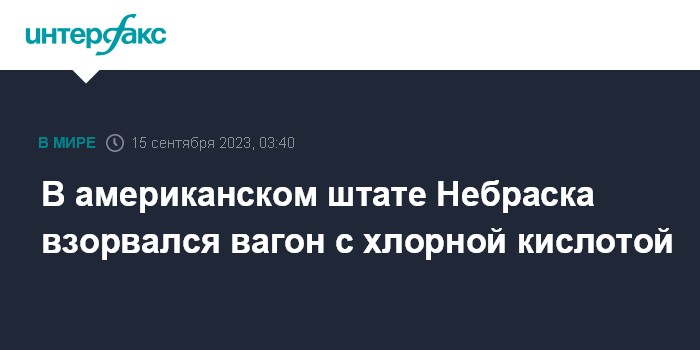 Москва. 15 сентября. INTERFAX.RU - Вагон с хлорной кислотой взорвался и загорелся на крупной железнодорожной станции Union Pacific в штате Небраска, власти эвакуируют людей из-за распространяющегося едкого дыма, сообщают американские СМИ.