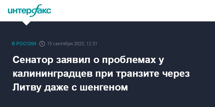 Москва. 15 сентября. INTERFAX.RU - Жители Калининградской области не могут проследовать транзитом через Литву в Россию даже при наличии шенгенской визы, сообщил "Интерфаксу" сенатор от региона Александр Шендерюк-Жидков в пятницу.