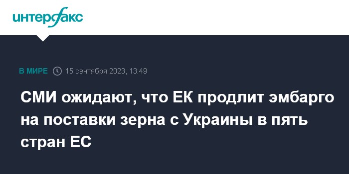 Москва. 15 сентября. INTERFAX.RU - Эмбарго на поставки зерновых с Украины в пять соседних стран ЕС, срок действия которого истекает в пятницу, вероятно, продлят, сообщила польская радиостанция Radio RMF.