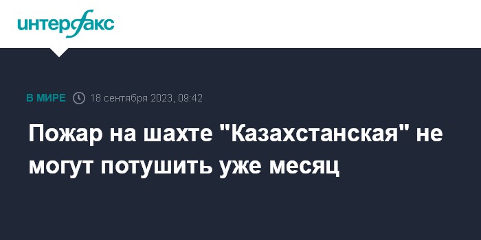 Москва. 18 сентября. INTERFAX.RU - Пожар на шахте "Казахстанская" АО "АрселорМиттал Темиртау", который начался 17 августа, еще не ликвидирован, сообщил министр по чрезвычайным ситуациям Казахстана Сырым Шарипханов.