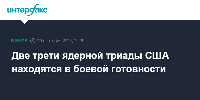 Москва. 18 сентября. INTERFAX.RU - Две трети американских стратегических ядерных сил находятся в постоянной боевой готовности к применению, сообщило в понедельник Стратегическое командование ВВС США.
