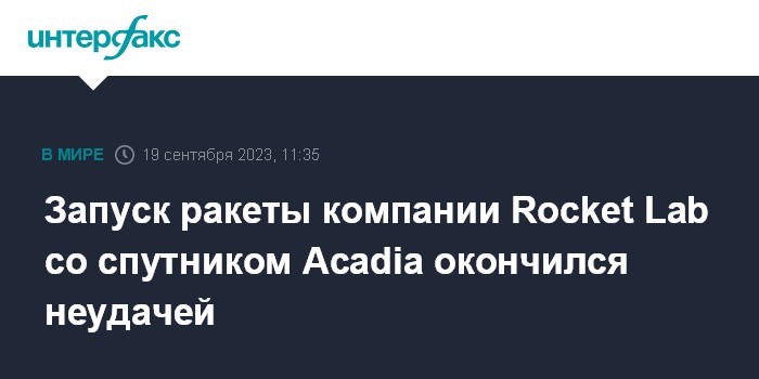 Москва. 19 сентября. INTERFAX.RU - Неудачей закончился во вторник запуск американской ракеты Electron, стартовавшей на орбиту с радиолокационным спутником Acadia компании Capella Space, сообщил разработчик носителя Rocket Lab.