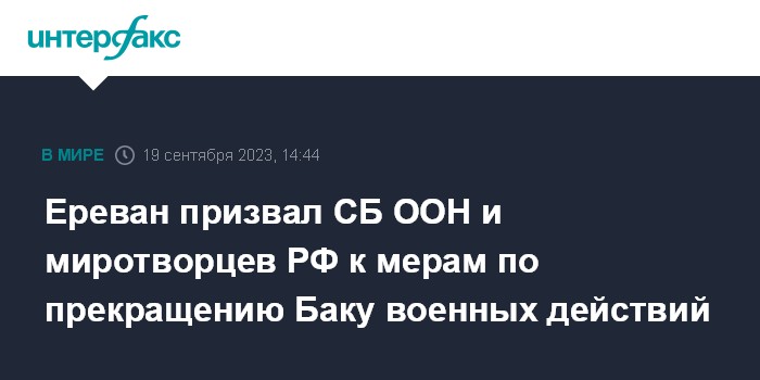 Москва. 19 сентября. INTERFAX.RU - Ереван призывает страны СБ ООН и миротворцев России предпринять меры по прекращению Азербайджаном боевых действий в Нагорном Карабахе.