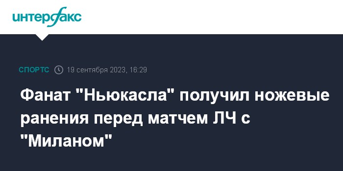 Москва. 19 сентября. INTERFAX.RU - Группа неизвестных в Италии нанесла ножевые ранения приехавшему на матч Лиги чемпионов УЕФА с местным "Миланом" болельщику английского футбольного клуба "Ньюкасл". Об этом сообщает Sky News.
