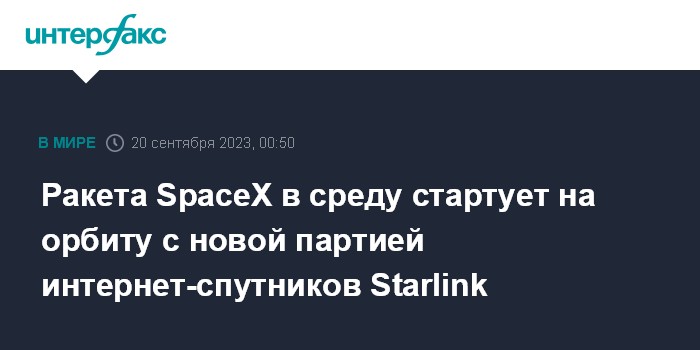 Москва. 20 сентября. INTERFAX.RU - Ракета-носитель Falcon 9 в среду по московскому времени стартует на орбиту с очередной партией из 22-х мини-спутников для пополнения орбитальной группировки глобальной сети интернет-покрытия системы Starlink, сообщила компания-разработчик SpaceX.