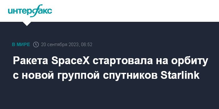 Москва. 20 сентября. INTERFAX.RU - Ракета-носитель Falcon 9 в среду по московскому времени стартовала на орбиту с очередной партией из 22 мини-спутников для пополнения орбитальной группировки глобальной сети интернет-покрытия системы Starlink, сообщила компания-разработчик SpaceX.