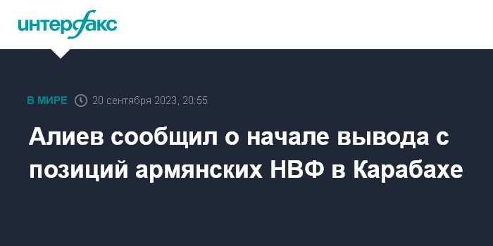 Москва. 20 сентября. INTERFAX.RU - Президент Азербайджана Ильхам Алиев заявил в видеообращении к народу о начале процесса вывода с позиций армянских незаконных вооруженных формирований в Карабахском регионе страны.