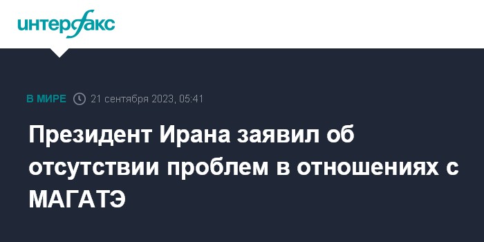 Москва. 21 сентября. INTERFAX.RU - Президент Ирана Ибрахим Раиси заявил, что у Ирана нет проблем в отношениях с Международным агентство по атомной энергии (МАГАТЭ) и Тегеран готов к тому, чтобы инспекции агентства на его ядерных объектах продолжались.