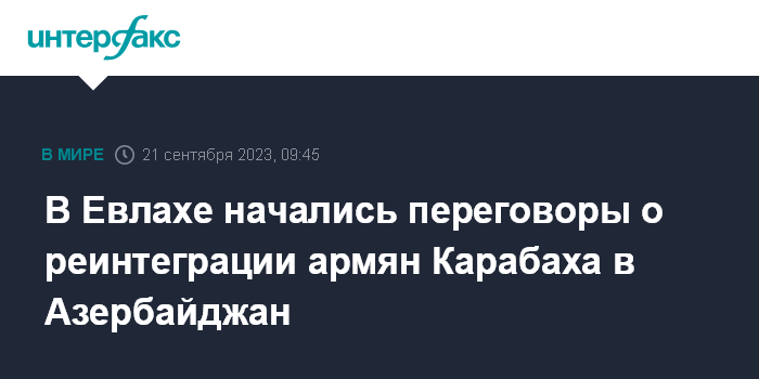 Москва. 21 сентября. INTERFAX.RU - В Евлахе началась встреча азербайджанской делегации с представителями армян Карабаха, стороны должны обсудить интеграцию армян Карабаха в Азербайджане, сообщают азербайджанские СМИ.