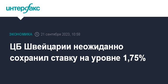 Москва. 21 сентября. INTERFAX.RU - Швейцарский национальный банк (SNB, центробанк страны) не стал менять базовую ставку, оставив ее на уровне 1,75% годовых. Опрошенные Trading Economics аналитики в среднем ожидали повышения ставки на 2%.