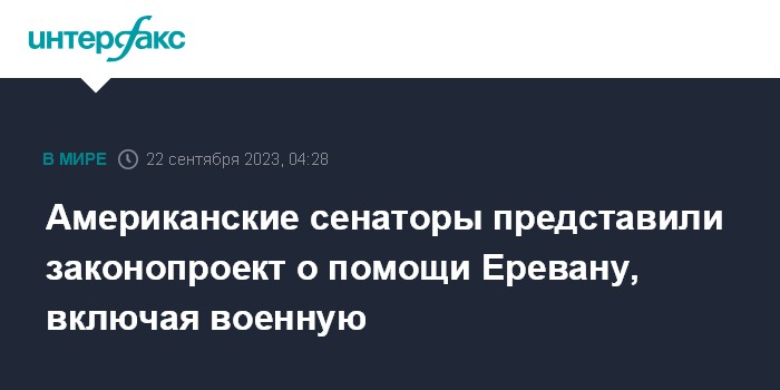 Москва. 22 сентября. INTERFAX.RU - Группа американских сенаторов, как демократов, так и республиканцев, разработали законопроект об оказании помощи Армении, в том числе военной, и введению санкций в отношении Азербайджана.
