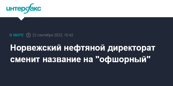 Москва. 22 сентября. INTERFAX.RU - Норвежский нефтяной директорат (Norwegian Petroleum Directorate, NPD) сообщил, что сменит название на Норвежский офшорный директорат (Norwegian Offshore Directorate, NOD) 1 января 2024 года.