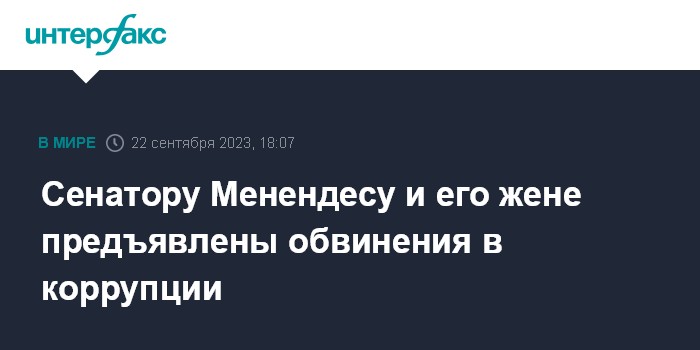 Москва. 22 сентября. INTERFAX.RU - Прокуратура предъявила обвинения в коррупции сенатору-демократу Роберту Менендесу от штата Нью-Джерси и его жене Надин, сообщает АР. В частности им вменили получение взяток наличными, золотыми слитками и дорогой машиной за действия в интересах правительства Египта.