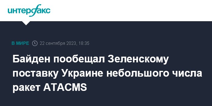 Москва. 22 сентября. INTERFAX.RU - Президент США Джо Байден сообщил украинскому коллеге Владимиру Зеленскому, что Вашингтон предоставит Украине небольшое число ракет ATACMS. Об этом сообщает NBC News со ссылкой на неназванных американских чиновников.