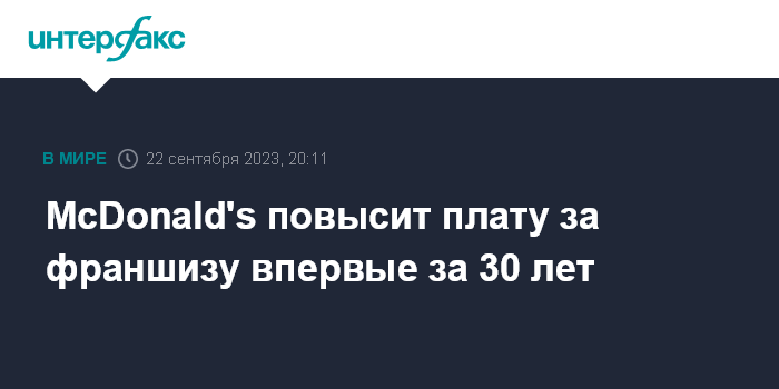 Москва. 22 сентября. INTERFAX.RU - Американская McDonald's Corp., крупнейшая в мире сеть ресторанов быстрого обслуживания, анонсировала первое за 30 лет повышение тарифов для владельцев франшизы в США и Канаде, пишет издание Barron's.