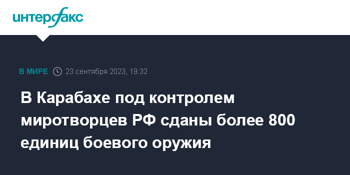 "Во исполнение достигнутых договоренностей о прекращении боевых действий вооруженными формированиями Карабаха продолжена сдача вооружения и военной техники под контролем российских миротворцев. На 23 сентября сдано: шесть единиц бронетехники, более 800 единиц стрелкового оружия, противотанковых средств и ПЗРК, около 22 тыс. боеприпасов", - сказано в бюллетене Минобороны России о деятельности российского миротворческого контингента в зоне нагорно-карабахского конфликта, распространённом в субботу.