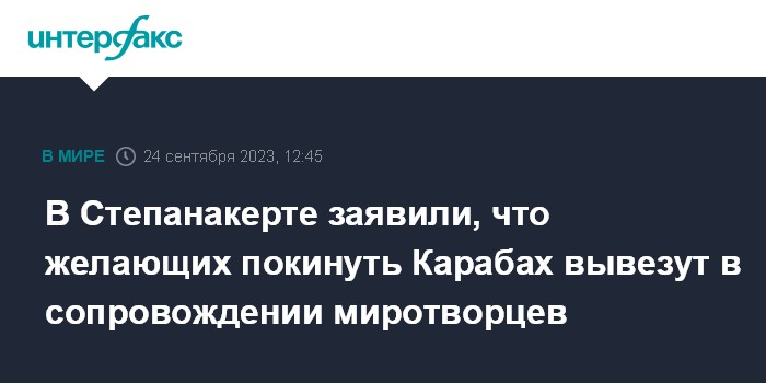 Москва. 24 сентября. INTERFAX.RU - Из Нагорного Карабаха в Армению при сопровождении российских миротворцев будут вывезены все желающие, заявили в воскресенье в правительстве непризнанного Карабаха.