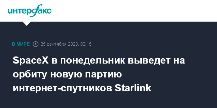 Москва. 25 сентября. INTERFAX.RU - Ракета-носитель Falcon 9 в понедельник стартует на орбиту с очередной партией из 21 мини-спутника для пополнения орбитальной группировки глобальной сети интернет-покрытия системы Starlink, сообщает компания-разработчик SpaceX.