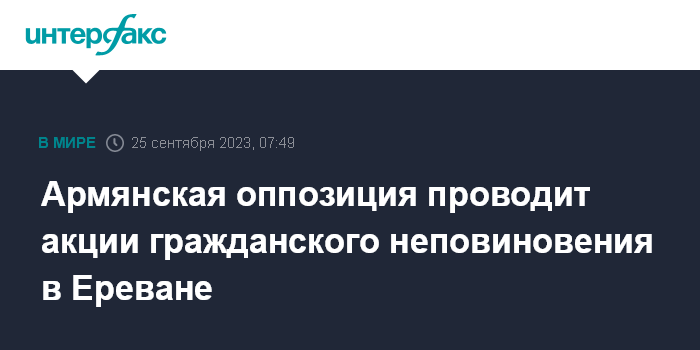 Москва. 25 сентября. INTERFAX.RU - Оппозиция Армении с утра понедельника начала блокировать улицы в шести из девяти административных районах Еревана в рамках акций гражданского неповиновения с целью отставки премьера Никола Пашиняна.