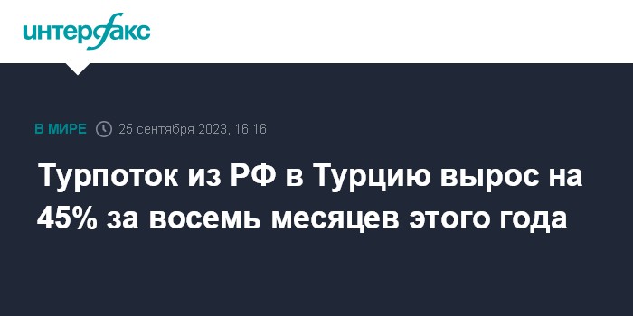 Турпоток из РФ в Турцию вырос на 45% за восемь месяцев этого года