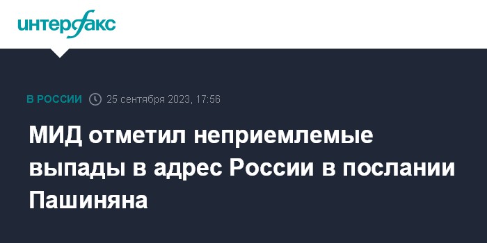 Москва. 25 сентября. INTERFAX.RU - В российском МИД заявили, что "послание премьер-министра республики Армения Пашиняна о независимости от 24 сентября содержит неприемлемые выпады в адрес России и не может не вызывать ничего, кроме отторжения".