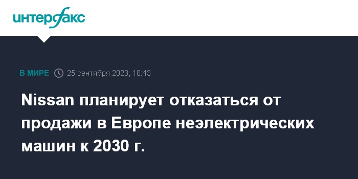 Москва. 25 сентября. INTERFAX.RU - Японский автопроизводитель Nissan Motor Co. намерен к 2030 году полностью прекратить продажу в Европе неэлектрических автомобилей, заменив их на электрокары и гибриды, сообщает Financial Times.
