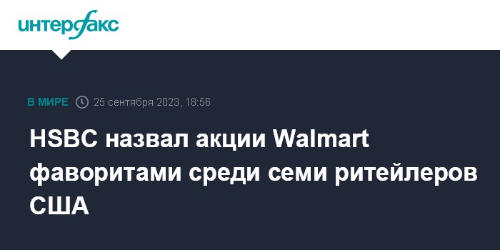 Москва. 25 сентября. INTERFAX.RU - Аналитики HSBC считают акции Walmart Inc. фаворитами среди семи американских ритейлеров, которым они присваивают рекомендации, сообщает MarketWatch.