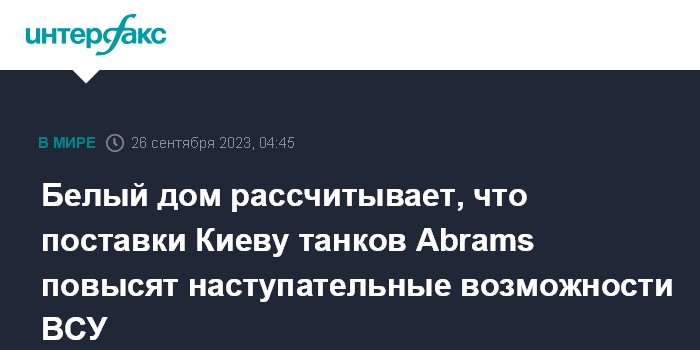 Москва. 26 сентября. INTERFAX.RU - Представитель Белого дома Джон Кирби считает, что поставка Украине американских танков Abrams будет способствовать наступательным действиям украинской армии.