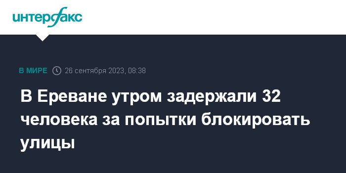 Москва. 26 сентября. INTERFAX.RU - Полиция Армении сообщила, что утром в Ереване были задержаны 32 человека, которые пытались блокировать улицы в центре города, требуя отставки премьер-министра Никола Пашиняна.